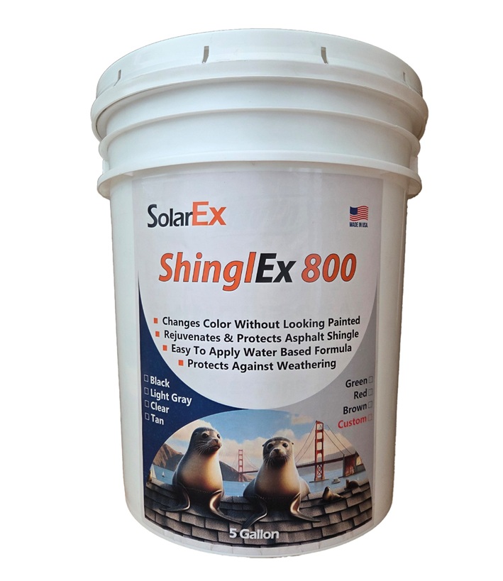 ShinglEx 800 is a waterborne, film-forming rejuvenator for aged asphalt shingles (acrylic—not a soy-based penetrant). It refreshes the roof’s appearance, helps retain mineral granules, and improves overall weather resistance. The developed formula adds an enhanced UV shield to help slow sun-induced aging and a mildew-resistant coating/film to help resist surface staining—delivering a renewed look without a painted appearance when tinted to roof-tone colors. (Apply to sound, repair-ready roofs; it’s not a leak repair.)